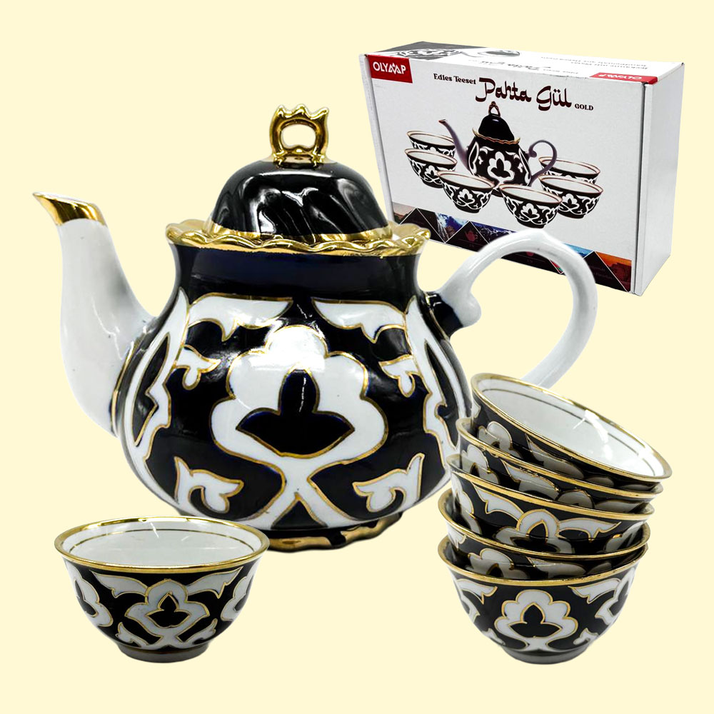 Service Pahta Gul 7 tlg, 1 Teekanne (0,9 L) + 6 Schalen, weiß-blau-gold, Usbekistan47830012 Teeservice "Pahta Gul" – edles usbekisches Geschirr in Weiß-Blau mit goldener Verzierung. Das Set besteht aus 7 Teilen: 1 Teekanne mit 0,9 Liter Fassungsvermögen und 6 Pialas (Teeschalen). Perfekt zum stilvollen Teeservieren im orientalischen Ambiente – zu Hause oder im Teesalon. Jedes Stück ist handgefertigt und handbemalt von Kunsthandwerkern aus Usbekistan. Jeder Artikel ist ein Unikat – leichte Abweichungen in Farbe und Muster sind möglich. Lebensmittelecht, umweltfreundlich und geeignet für den privaten oder gewerblichen Gebrauch. Hersteller-Angaben, Warnhinweise und Sicherheitsinformationen Hersteller: Olymp Handels GmbH Olymp Handels GmbH Adresse: Auf der Höhe 24, 47059 Duisburg Email: info@olymp48.de |