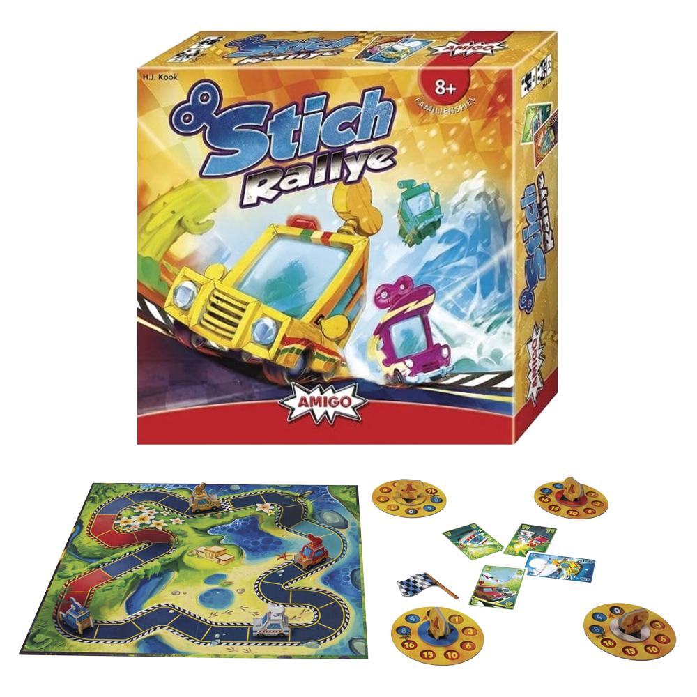 Brettspiel Spel Stich Rallye8701102150 Autos an die Startlinie — Karten verteilt — fertig — los!<br> Bei „Stich Rallye“ treffen Stich- und Rennspiel aufeinander.<br> Geschickt steuert ihr eure Autos mit Stichen über die Piste und verwendet Rallye-Karten, um Mitspieler auszubremsen oder rasant zu überholen.<br> Mach den Stich im richtigen Moment und flitze mit deinem aufgezogenen Motor vor allen anderen ins Ziel.<br><br> Zwei abwechslungsreiche Strecken warten auf euch.<br> Also: Fuß aufs Gas, Hände an die Karten und los geht’s!<br><br> Inhalt:<br> 45 Rallye-Karten<br> 5 Rallye-Autos<br> 5 Motor-Tableaus<br> 1 doppelseitiger Spielplan<br> 1 Startspieler-Fahne<br> 1 Spielanleitung<br><br> |