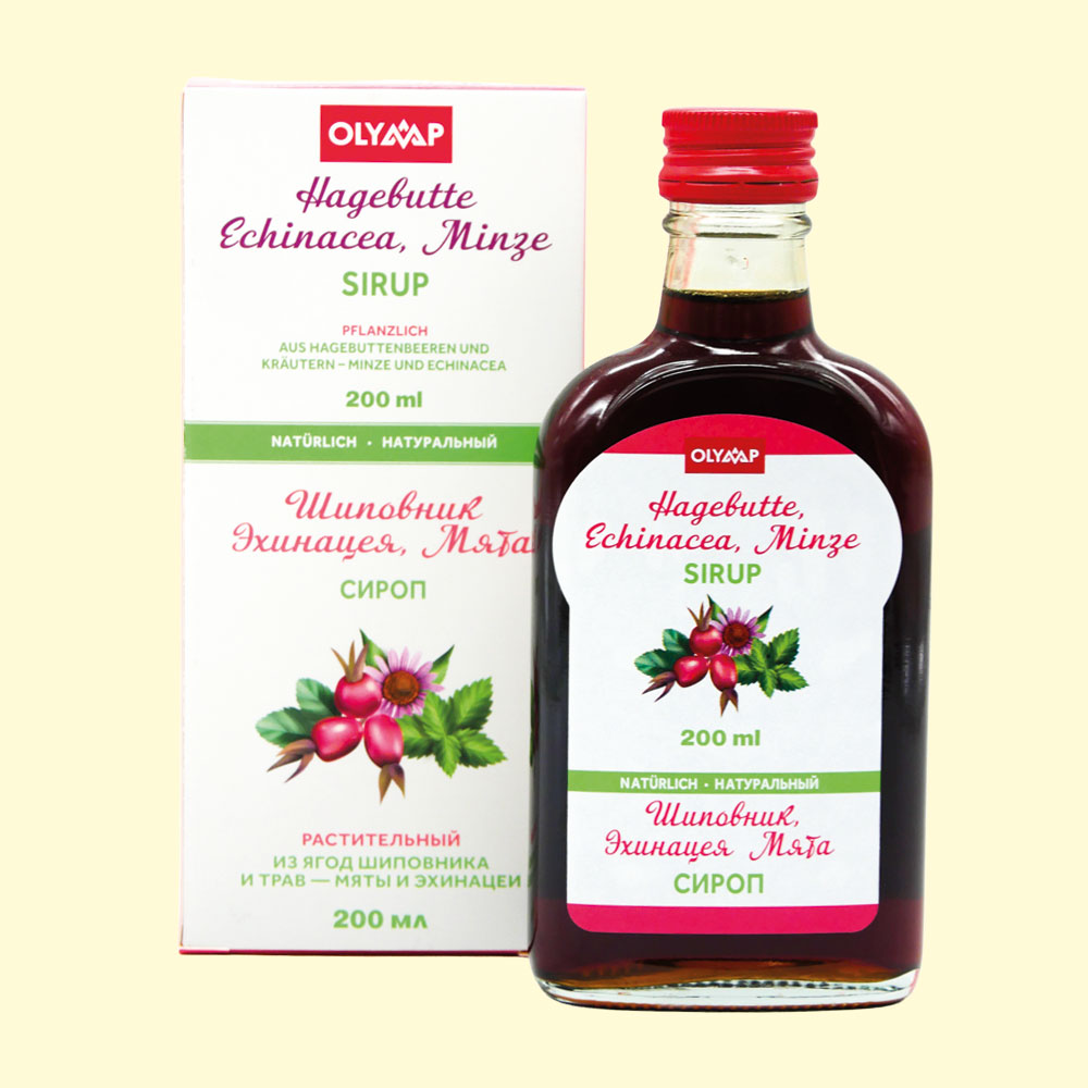 Hagebutte-Echinacea-Minze Sirup, 200 ml381859867 Sirup mit Hagebutte, Echinacea und Minze – natürliche Unterstützung für das Immunsystem.<br> Hagebutte ist reich an Vitamin C, Echinacea stärkt den Körper und Minze wirkt erfrischend und belebend.<br> Ideal für die Zubereitung gesunder Getränke, Tees und Desserts.<br> Inhalt: 200 ml.<br><br> |