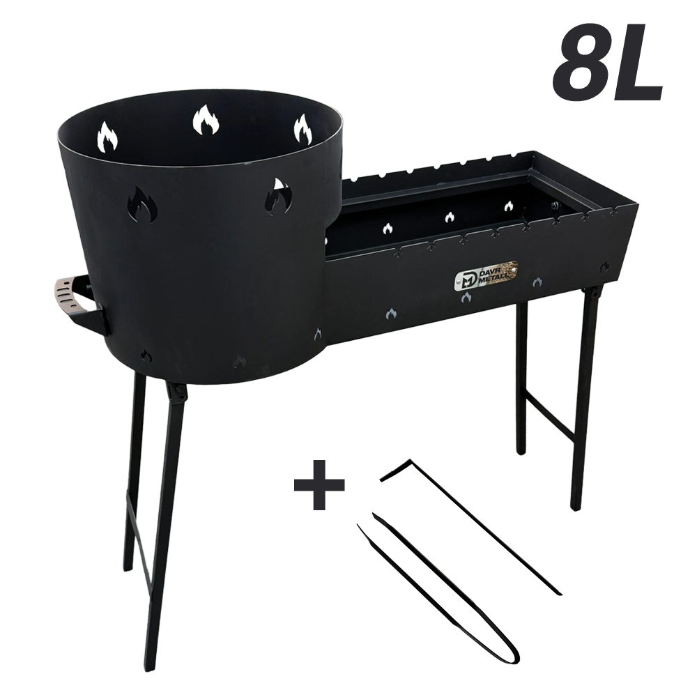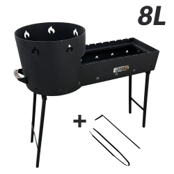 2-in-1 Utschag 8L mit Mangal für 8 Spieße, inkl. Zange & Kamingabel478162089 Universal-Mangal 2 in 1 mit rundem Utschag, geeignet für einen 8-Liter-Kazan und für 8 Schaschlik-Spieße. Dieses multifunktionale Gerät vereint Mangal, Holzkohlegrill und Feldküche in einem kompakten Design. Sie können gleichzeitig kochen, braten und grillen – alles in einem Gerät.<br> Der seitlich integrierte Utschag-Ofen ermöglicht das Kochen im Kazan, während der Mangal-Bereich für bis zu 8 Spieße ausgelegt ist. Die tiefe Kohlewanne sorgt für gleichmäßige und langanhaltende Hitze, unterstützt durch eine effektive Luftzirkulation über spezielle Zuluftöffnungen.<br> Gefertigt aus 2 mm starkem Stahl für hohe Stabilität und Langlebigkeit, mit hitzebeständiger Pulverbeschichtung. Ausgestattet mit 4 stabilen Füßen und 2 Metallgriffen. Im Lieferumfang enthalten sind Grillzange und Kamingabel (Schürhaken).<br><br> Abmessungen (L×B×H): 83 × 28 × 77 cm (Mangal)<br> Gesamthöhe mit Utschag: 93 cm<br> Gewicht: 25 kg<br> |