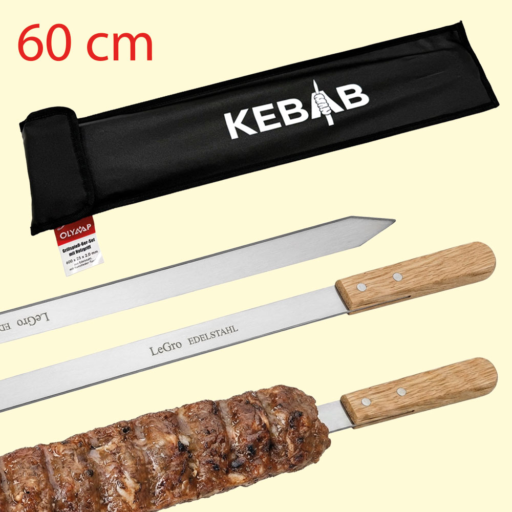 Grillspieß-6er-Set für Kebab aus Edelstahl mit Holzgriff und Kunstledertasche, 60 × 2,5 × 0,2 cm898562140 Kebab skewers made of stainless steel with wooden handles and faux leather bag — an ideal choice for grilling meat.<br> Total skewer length: 60 cm.<br> Wooden handle length: 12.5 cm.<br> Working part size: 47.5 × 2.5 × 0.2 cm.<br> Flat design prevents meat from spinning during grilling.<br> Durable stainless steel is resistant to high temperatures and corrosion.<br> The wooden handle is comfortable to hold and does not heat up.<br> Suitable for barbecue, grill, and open fire cooking.<br> Set includes: 6 pcs in a faux leather bag.<br><br> |