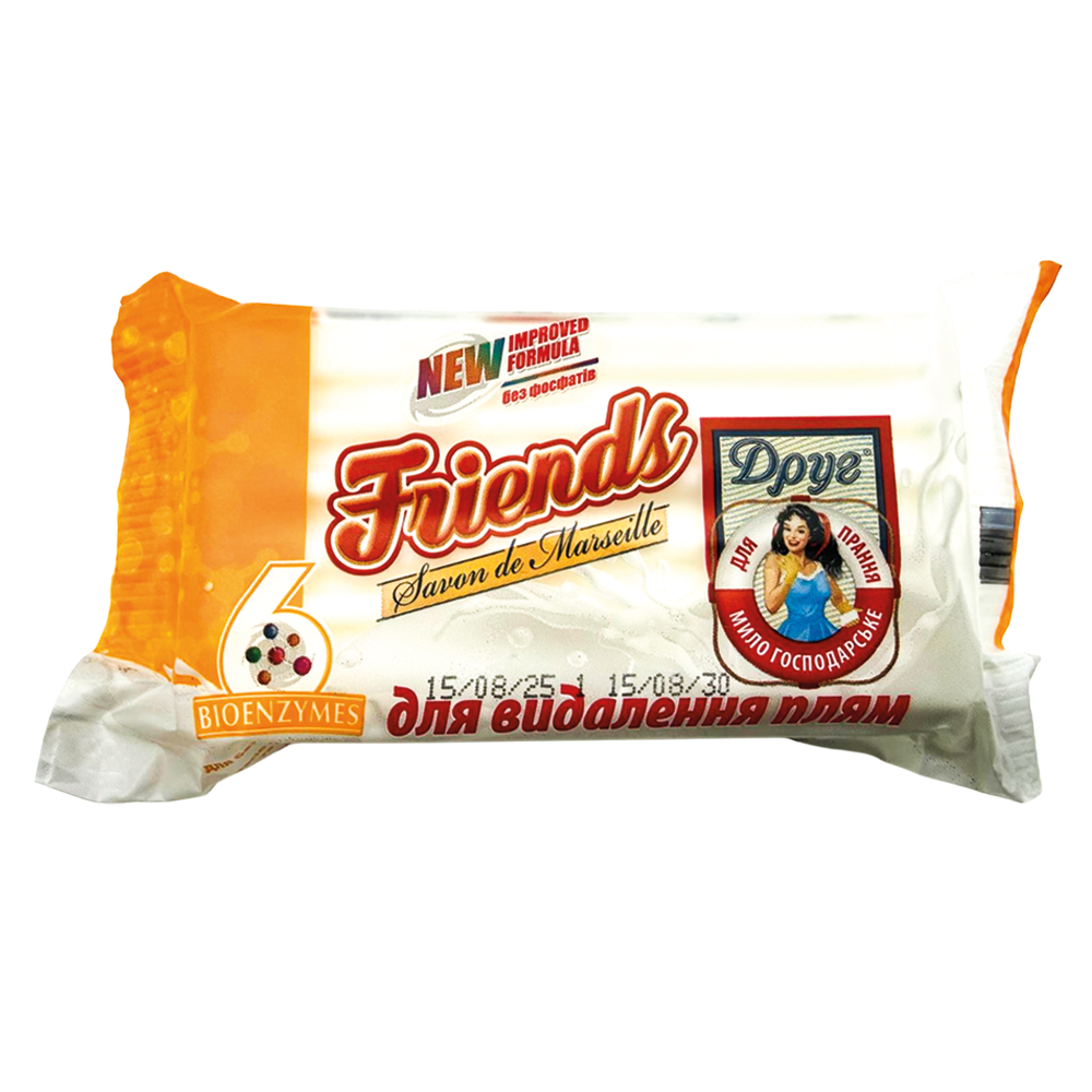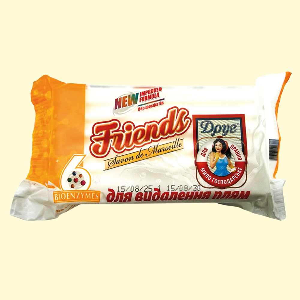 Хозяйственное твердое мыло Friends для удаления пятен, 125 г9991-475161164 Уникальная формула специально разработана научно-производственной лабораторией и содержит активные добавки направленного действия, обеспечивающие:<br> • отбеливание,<br> • удаление пятен,<br> • бережное воздействие на деликатные ткани и кожу рук,<br> • эффективное стирка детского белья.<br><br> Хозяйственное мыло «Friends» изготовлено из высококачественного растительного сырья. Все виды линии содержат приятные ароматические композиции, придающие белью свежий запах.<br><br> В состав мыла введена эффективная добавка для удаления пятен. Для лучшего результата рекомендуется нанести мыло на пятно на 10–15 минут, затем стирать как обычно. Для застарелых пятен можно повторить обработку.<br><br> <strong>Удаляет загрязнения:</strong><br> бактерии и микробы, белковые и жировые пятна, вино, жир, желтизну, остатки пищи, кофе, косметику, масляные загрязнения, неприятный запах, пятна, следы пота, стойкие загрязнения, траву.<br><br> <strong>Особенности:</strong><br> • Гипоаллергенно<br> • Для детского белья<br> • Для всех типов тканей<br> • Эффективно даже в холодной воде<br> • Отбеливающие свойства<br> • Быстрое действие<br> • Легко выполаскивается<br>  |