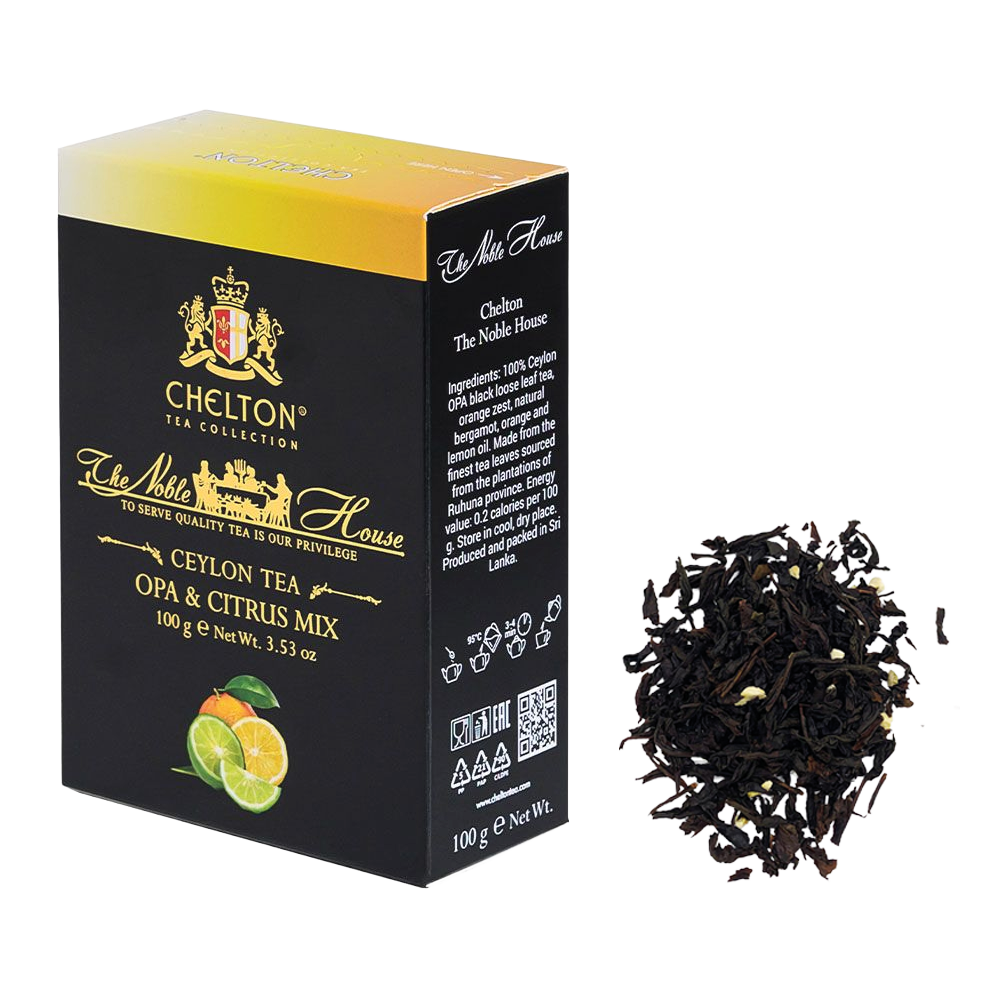 Чай Chelton The Noble House – Black OPA + Citrus-Mix премиум, рассыпной чёрный чай, 100 г9401-80-100 Высококачественная чайная смесь из крупнолистового 100 % цейлонского чёрного чая (OPA) из провинции Рухуна на Шри-Ланке. Обогащён натуральными экстрактами бергамота, апельсина, лайма и цедры апельсина. Все сорта чая Chelton собираются вручную.<br><br> Состав:<br> 100 % чёрный цейлонский листовой чай (OPA), натуральные экстракты бергамота, апельсина, лайма и апельсиновой цедры<br> 100 г рассыпного чая в ароматозащитном пакете |