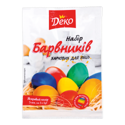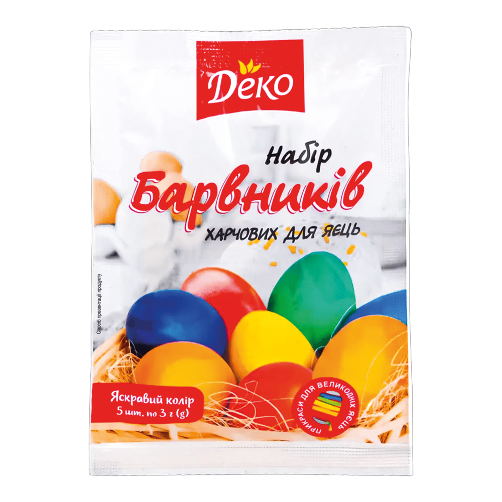 Набор пищевых красителей для яиц, 5 цветов по 3 г381255562 Набор красителей для яиц, 5 цветов<br><br> Подарите пасхальным яйцам яркие и насыщенные оттенки с помощью набора пищевых красителей. В комплект входят 5 классических цветов: жёлтый, зелёный, оранжевый, красный и синий.<br><br> Состав набора:<br> 5 пакетиков по 3 г<br><br> Расход:<br> 1 пакетик рассчитан на окрашивание до 20 яиц<br> Весь набор — до 100 яиц<br><br> Способ применения:<br> Содержимое одного пакетика залить 250 мл горячей воды (70–90 °C).<br> Добавить 1 столовую ложку 9% уксуса и тщательно размешать.<br> Поместить предварительно сваренные яйца в раствор на 1–2 минуты.<br> Достать яйца и выложить на ткань для обсыхания.<br><br> Красители обеспечивают равномерный цвет и просты в использовании — отличный выбор для праздничного декора.<br><br> |