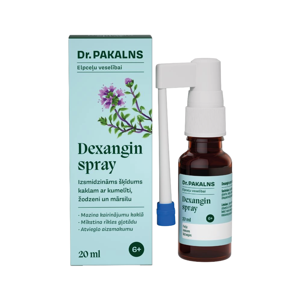 DR.PAKALNS Dexangin спрей, 20 мл9996-490703995 DEXANGIN спрей содержит экстракт цветов ромашки, листьев лечебной солодки и листьев мелиссы, которые помогают поддерживать здоровье дыхательных путей во время простуды, успокаивают воспалённую слизистую и оказывают смягчающее действие, а также помогают уменьшить раздражение в горле. Цветки ромашки облегчают дыхание при сухом кашле. При кратковременной осиплости помогут листья лечебной солодки. Перед использованием флакон взболтать и снять колпачок распылителя. Поместить насадку в полость рта и дважды нажать на механизм распылителя, вводя одну дозу (0,2 мл). Детям от 6 до 11 лет — 3 раза в день (0,6 мл). Подросткам от 12 лет и взрослым — 3–5 раз в день (0,6–1,0 мл). Рекомендуемая продолжительность применения — 1 неделя. |
