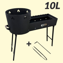 2 в 1 Учаг 10 л с мангалом на 8 шампуров, с щипцами и кочергой478162096 Универсальный мангал 2 в 1 с круглым очагом (учагом), рассчитанный на казан 10 л и 8 шампуров. Это полноценная полевая кухня, в которой можно одновременно готовить, жарить и готовить на гриле — всё в одном устройстве.<br> Боковой встроенный очаг предназначен для приготовления блюд в казане, а основная часть мангала рассчитана на 8 шампуров. Глубокая жаровня обеспечивает длительное и равномерное горение углей, а система поддува гарантирует отличную циркуляцию воздуха.<br> Конструкция выполнена из стали толщиной 2 мм, с термостойким порошковым покрытием. Мангал оснащён 4 устойчивыми ножками и 2 металлическими ручками. В комплект входят щипцы и кочерга.<br><br> Габариты (Д×Ш×В): 84 × 28 × 78 см (Мангал)<br> Общая высота с очагом: 94 см<br> Вес: 26 кг<br> |