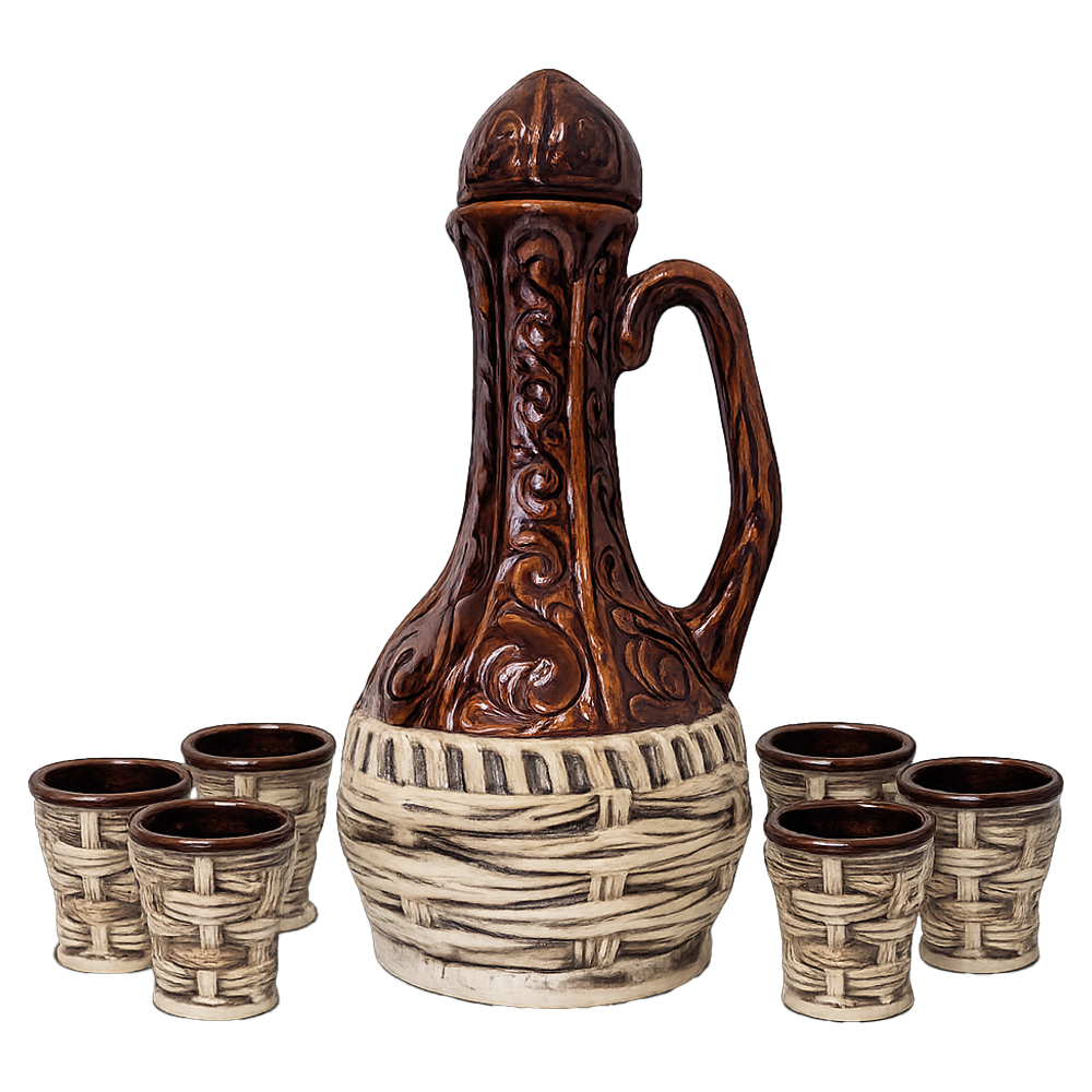 Керамический винный набор, графин 1 л + 6 бокалов381261990 Керамический винный набор, графин 1 л + 6 бокалов.<br><br> Изготовлен из натуральной керамики с декоративной отделкой.<br> Графин (Stauf) объёмом 1 л идеально подходит для подачи вина, а комплект из 6 бокалов позволяет красиво и гармонично сервировать стол.<br> Керамика придаёт набору натуральный цвет, прочность и долговечность, а также помогает дольше сохранять температуру напитка по сравнению со стеклом.<br><br> Рекомендации по использованию:<br> Использовать только для холодных или слегка тёплых напитков.<br> Перед первым использованием промыть тёплой водой.<br> Не ставить на открытый огонь и не нагревать в микроволновой печи.<br> Ручная мойка предпочтительнее; избегать абразивных губок и агрессивных моющих средств.<br> Не оставлять напитки в графине на длительное время во избежание изменения вкуса или запаха.<br><br> Особенности:<br> Материал: натуральная керамика<br> Объём графина: 1 л<br> Количество бокалов: 6<br> Декоративное оформление<br> Подходит для подарка и сервировки праздничного стола<br><br> |