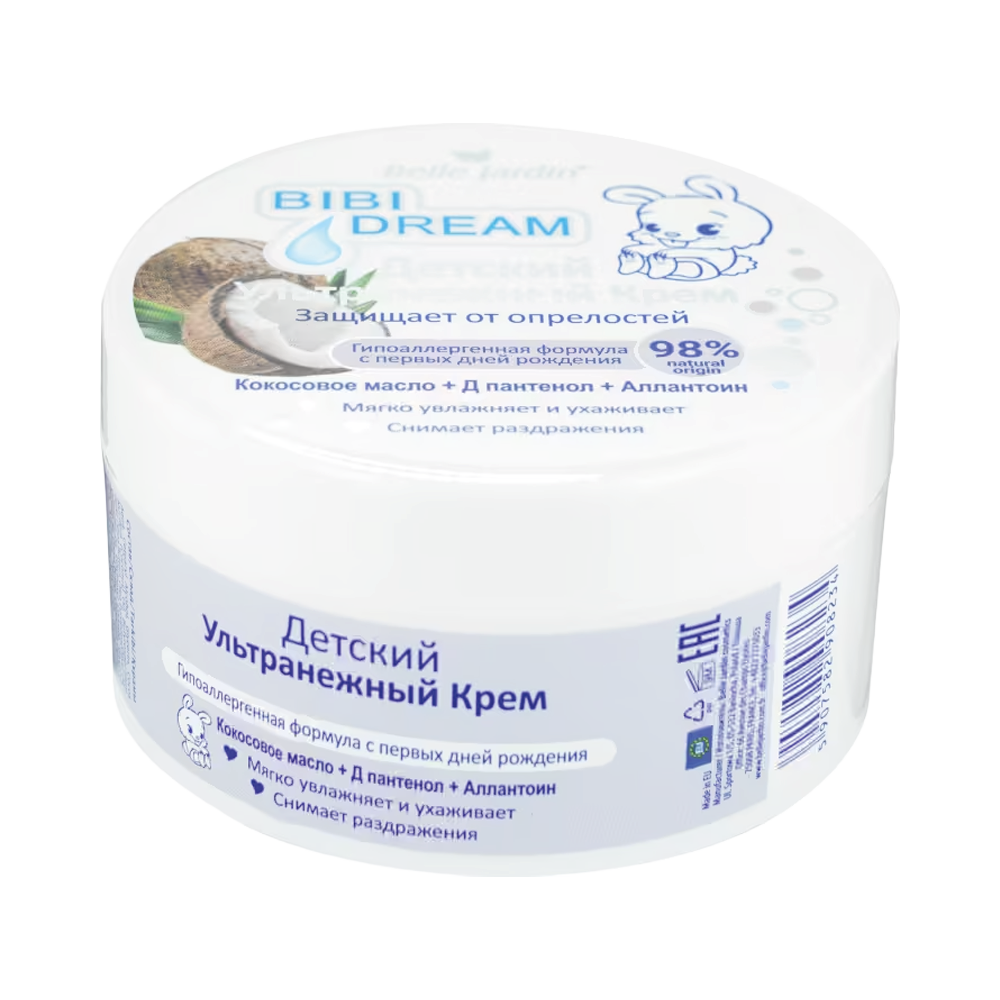 Belle Jardin Универсальный крем Кокосовое масло + D-пантенол + Аллантоин, 200 мл9991-475108234 BABY ULTRA GENTLE КРЕМ Кокосовое масло + D-пантенол + Аллантоин Защищает от раздражений Гипоаллергенная формула Подходит с первого дня жизни Мягко увлажняет и ухаживает Успокаивает раздражения Крем Belle Jardin Baby Ultra Gentle обеспечивает деликатный уход и защиту кожи ребёнка с первых дней жизни. Гипоаллергенная, успокаивающая и защитная формула помогает увлажнять кожу, смягчает сухость и раздражения, создавая комфортное ощущение. Ингредиенты: кокосовое масло, аллантоин, D-пантенол. Крем также рекомендуется для взрослых с чувствительной и склонной к аллергии кожей. Применение: Нанесите небольшое количество крема на кожу, распределяя лёгкими массажными движениями. Можно использовать регулярно для защиты и ухода за чувствительной кожей. |