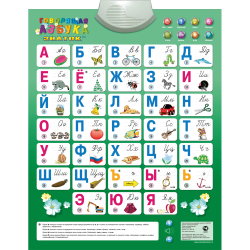 Электронный звуковой плакат Говорящая азбука, русский язык, 8 режимов работы491870082 Новая версия популярнейшего звукового плаката «Говорящая Азбука» предназначена для детей и взрослых, начинающих изучать русский язык. Дополнения в плакат внесены в соответствии с пожеланиями родителей и педагогов. В процессе использования можно познакомиться не только с «именем» буквы, но и её звуком и порядковым номером, услышать стихи и весёлую песенку про алфавит. Имеет 8 режимов работы. Режимы: Свободный выбор букв; Изучение – воспроизведение алфавита; Знакомство со звуками; Весёлая песенка про алфавит; Стихотворение о предмете на картинке; Произношение цифр, соответствующих буквам; Поиск предмета или отгадывание загадки; Экзамен – проверка знания алфавита. Плакат имеет влагозащитную поверхность и может размещаться на столе или на стене. Размер: 470 × 585 мм. Для экономии батареек предусмотрено автоматическое отключение через 5 минут бездействия. Регулируемая громкость. Работает от 3 батареек AAA, 1,5 В (соблюдайте полярность). Батарейки в комплект не входят. Рекомендовано для детей от 3 лет. |