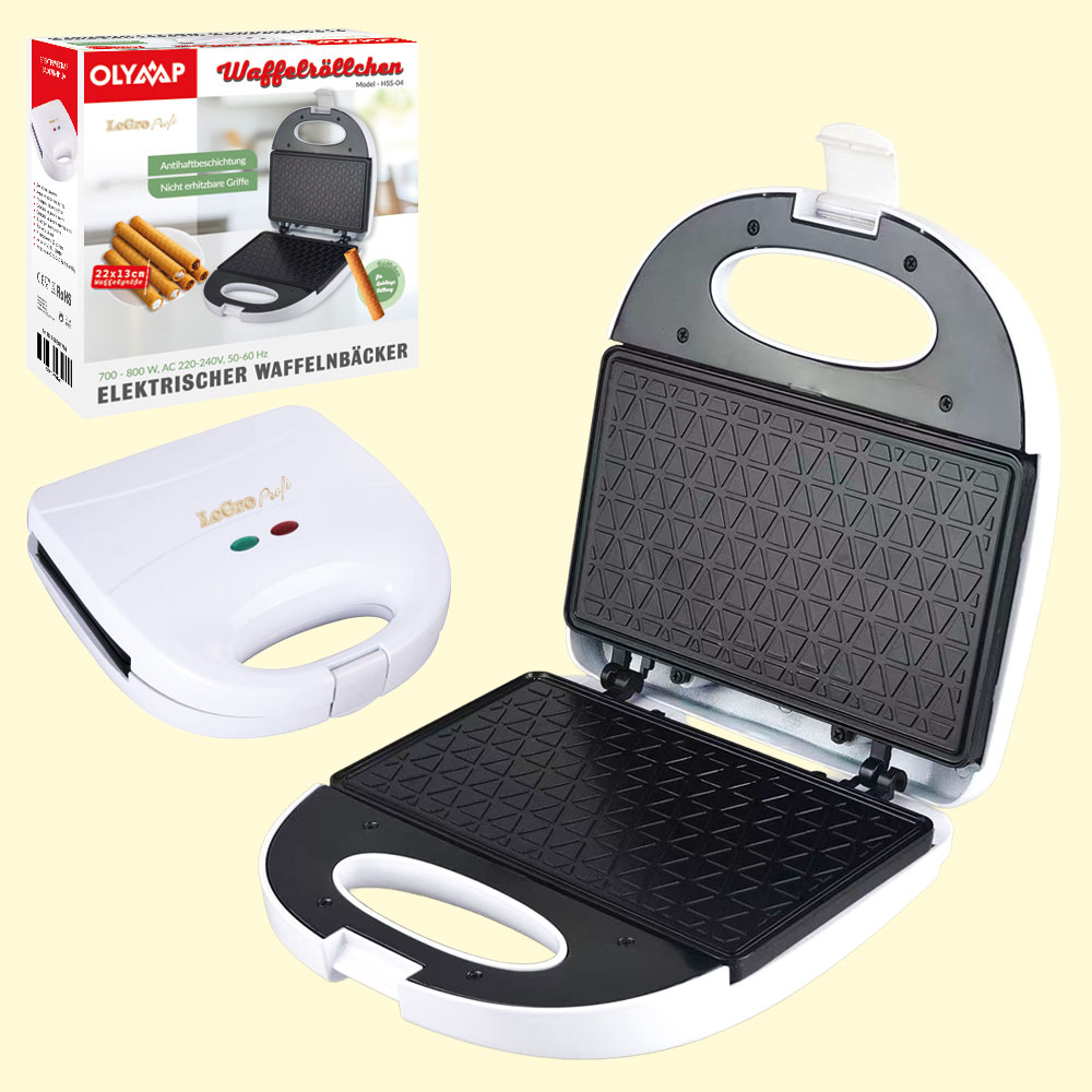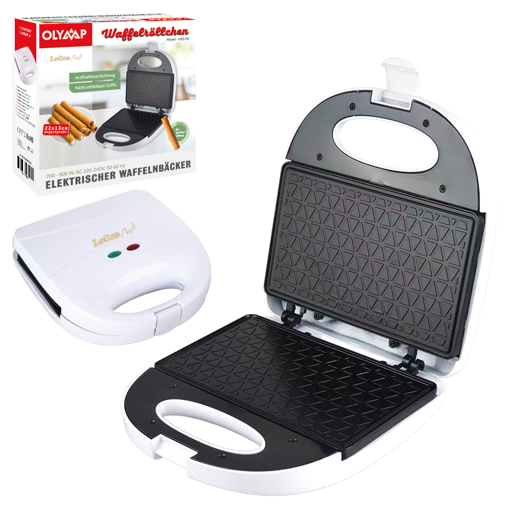 Электрическая вафельница - модель HSS-04, размер вафель 22 × 13 см, мощность 700–800 Вт898561761 Электрическая вафельница для приготовления тонких вафель и вафельных трубочек.<br> Антипригарное покрытие обеспечивает удобство использования и лёгкую очистку.<br> Ненагревающиеся ручки для безопасного использования.<br> Световой индикатор сети и индикатор готовности.<br> Жаропрочный корпус из пластика.<br> Замок-защёлка.<br> <br> Характеристики:<br> Размер вафель: 22 × 13 см<br> Мощность: 700–800 Вт<br> Напряжение: 220–240 В, 50/60 Гц<br> Гарантия: 2 года |