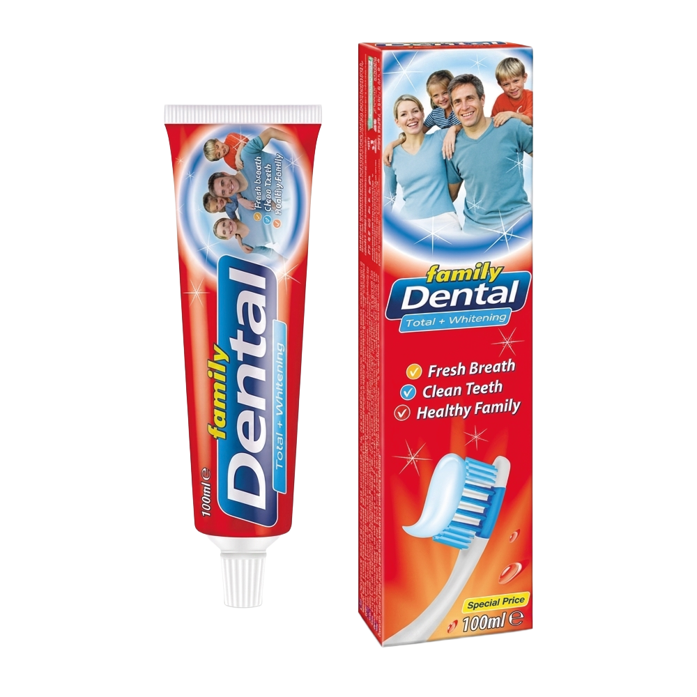 DENTAL Family зубная паста, комплексный уход и отбеливание, 100 мл9991-475119957 Зубная паста DENTAL Family для комплексного ухода за полостью рта. Помогает мягко очищать зубы и удалять налёт. Поддерживает ощущение чистоты и свежести дыхания. Подходит для ежедневного использования всей семьёй. |